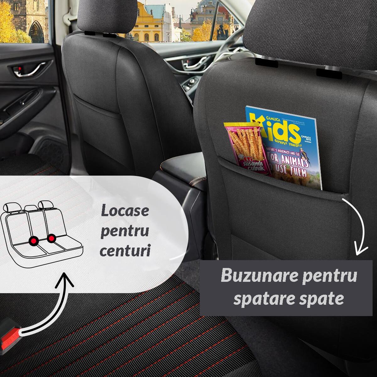Husele scaunelor fata au spatare cu buzunare generoase de 22 x 27 cm, pentru a depozita diverse obiecte.