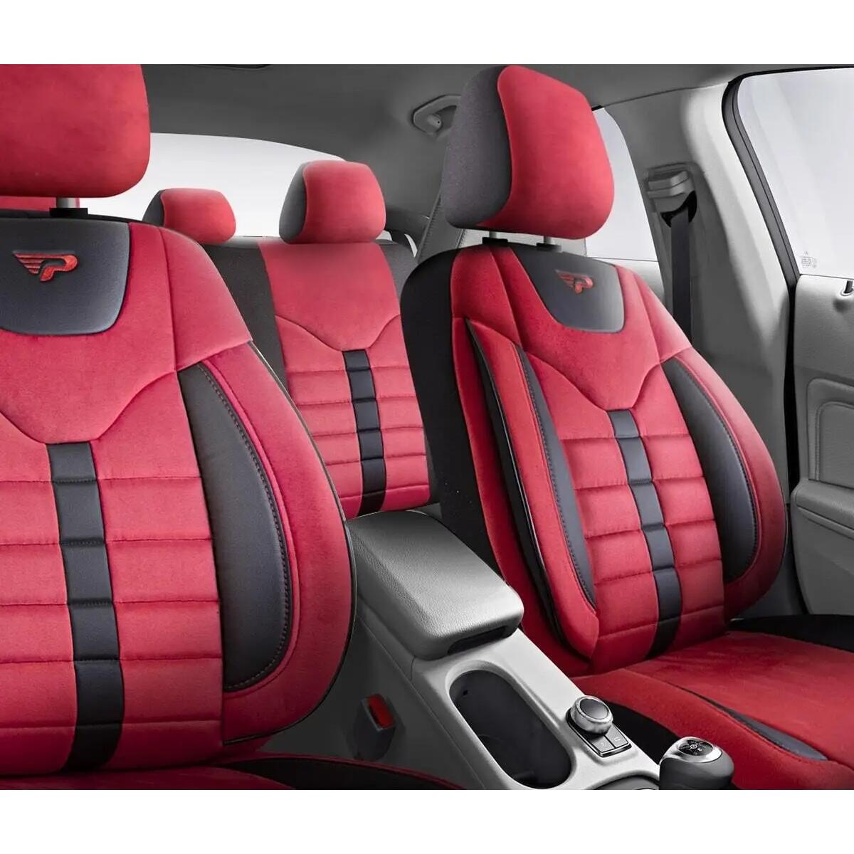 Set Huse Scaune Auto Panda Toronto, tip Alcantara, cu fermoare pentru bancheta rabatabila, rosu negru, 11 piese
