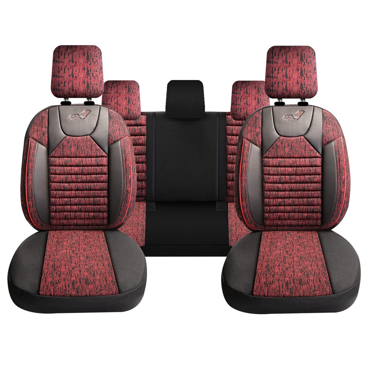 Set Huse Scaune Auto pentru Dacia Sandero - Panda PSC02, material textil cu piele ecologica, cu fermoare pentru bancheta rabatabila, visiniu cu negru, 11 piese