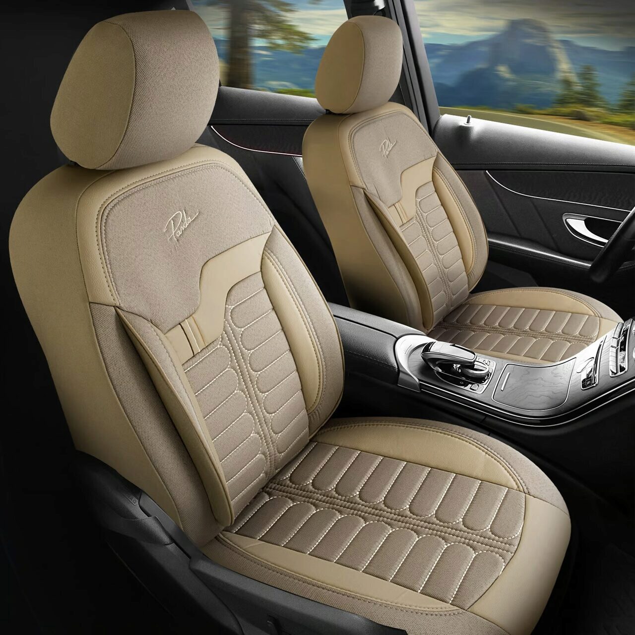 Set Huse Scaune Auto pentru Mercedes-Benz S-Class - Panda Londra, cu fermoare pentru bancheta rabatabila, bej, 11 piese