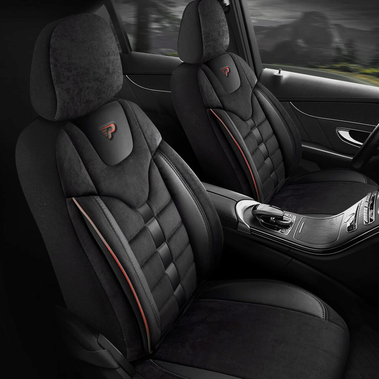 Set Huse Scaune Auto pentru Volvo V40 - Panda Toronto, tip Alcantara, cu fermoare pentru bancheta rabatabila, negru cu cusatura rosie, 11 piese