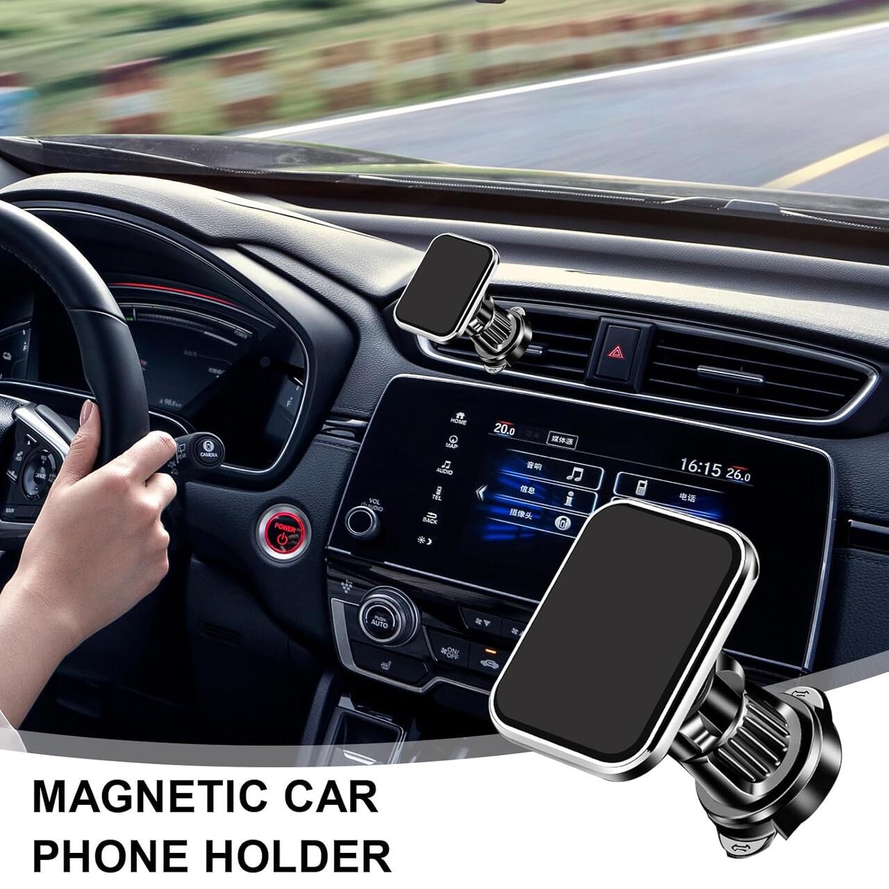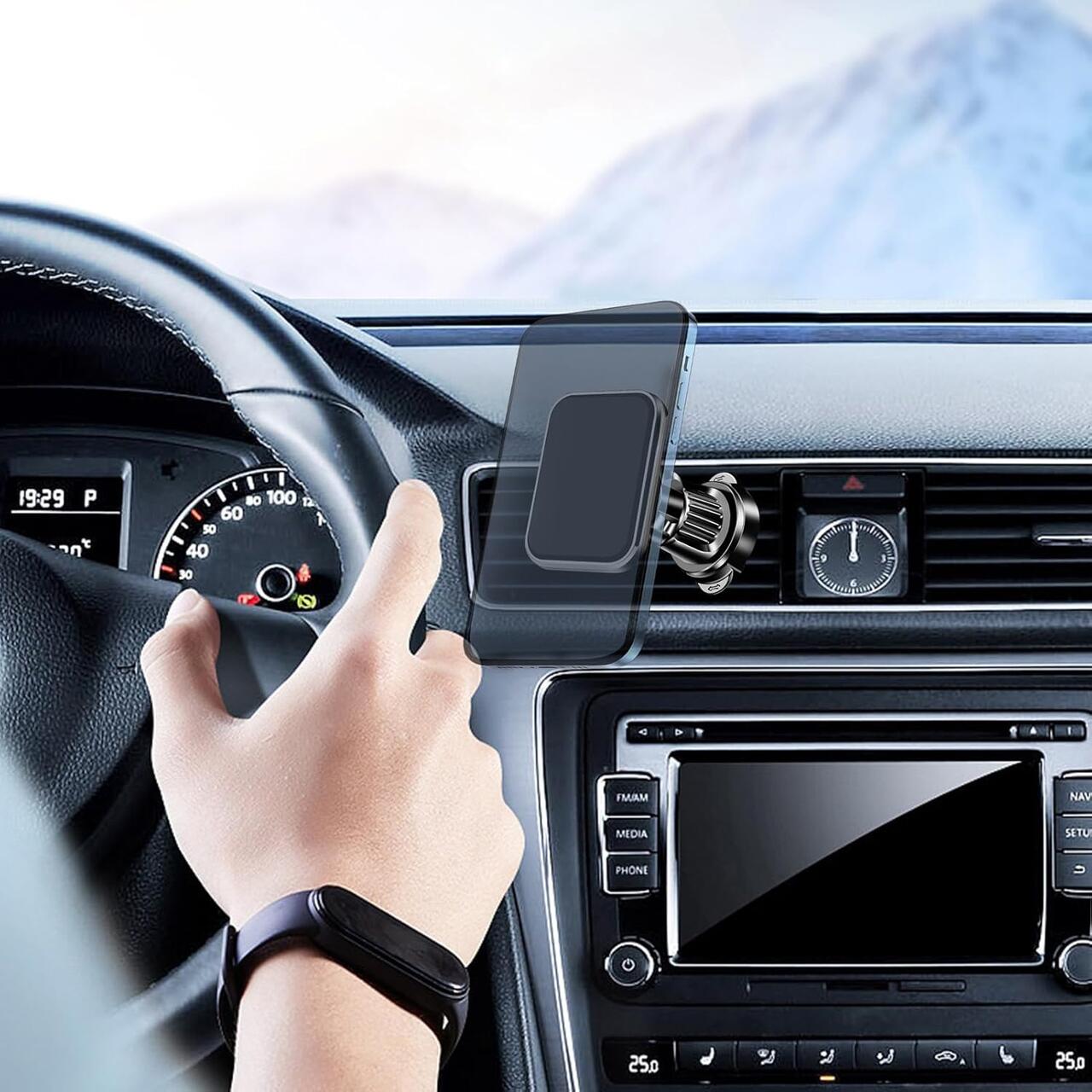 • Compatibilitate Universala: Sistemul de prindere "carlig" se adapteaza la majoritatea grilelor de ventilatie standard (orizontale si verticale), iar suprafata magnetica funcționeaza cu orice telefon pe care s-a aplicat placuta metalica.